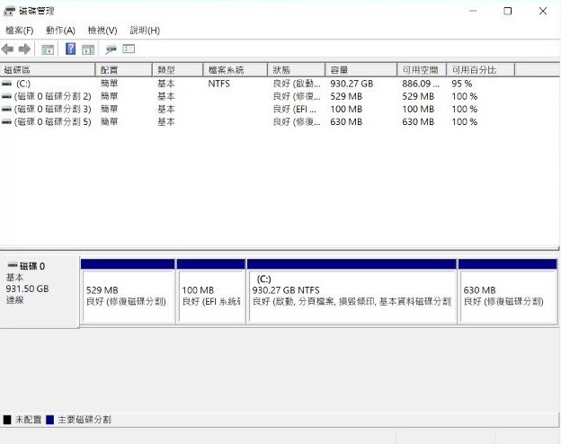 我自己的電腦只有一個硬碟,所以你有看到只有一列(其中包含開機磁區以及 C 槽)