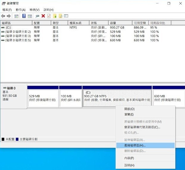 對 C 槽的部份右鍵叫出選單,選擇 壓縮磁區