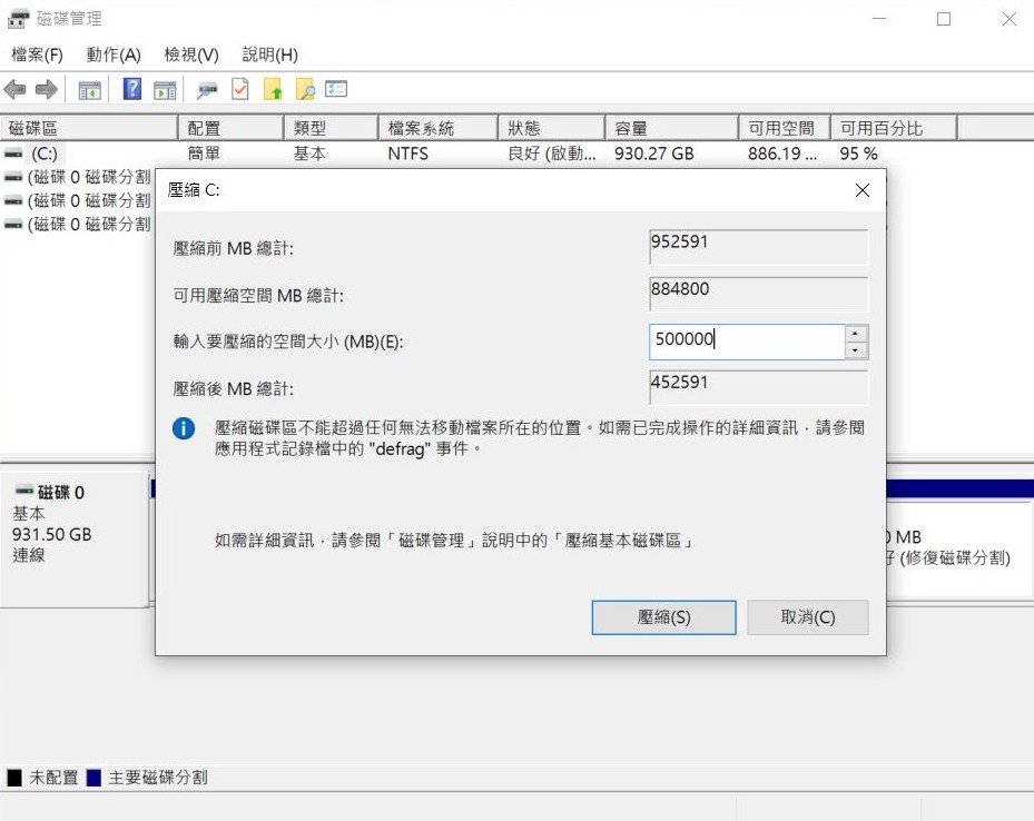 因此你在切磁碟分區的時候,必須先進行壓縮,將資料全部集中到一起,再切割就沒問題了